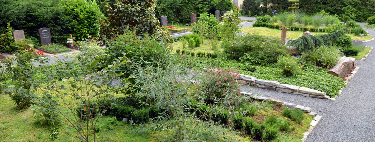 Sie finden dort Ruhestellen aller Grabarten und -formen, vom Einzelurnengrab bis zum Erdbestattungsfamiliengrab inklusive Grabmal mit Beschriftung.